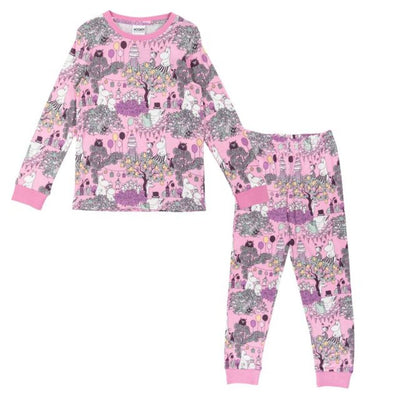 Fallegt bleikt Múmín náttfatasett skreytt myndum af Múmínálfunum og vinum þeirra sem eru að halda veislu.