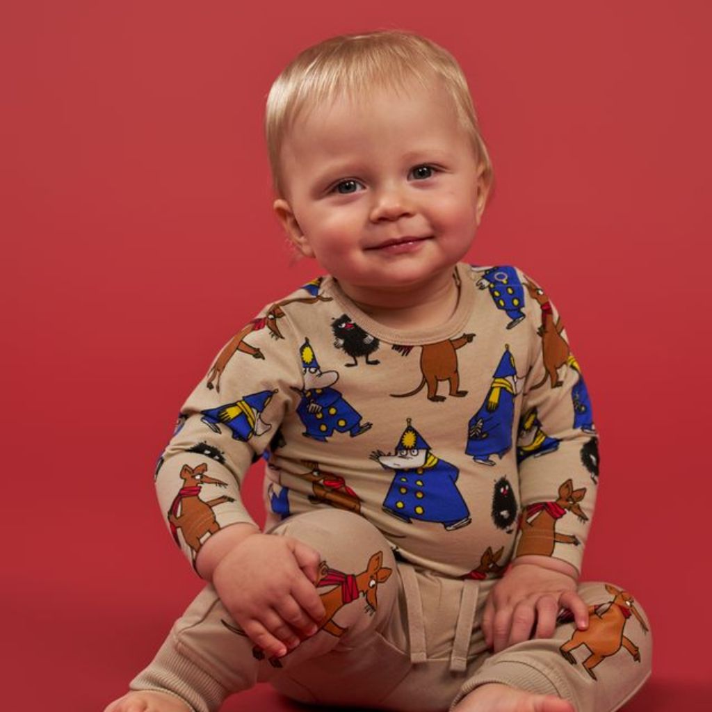 Yndisleg beige lituð Moomin samfella skreytt myndum af nokkrum af vinum okkar í Múmíndal.