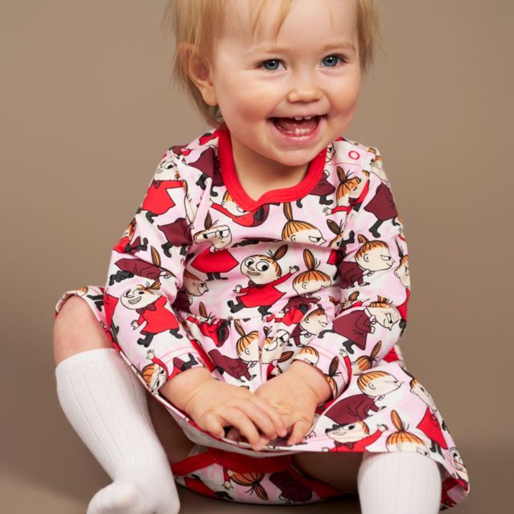 Yndislegur bleikur Múmín ungbarnakjóll úr lífrænni bómull.