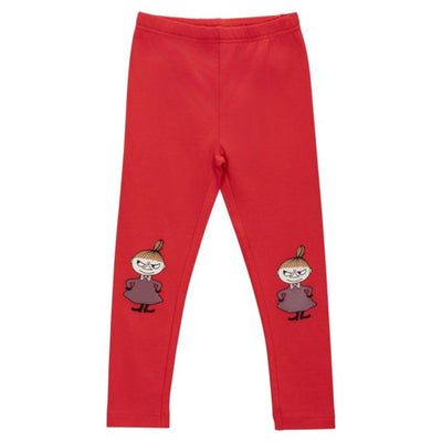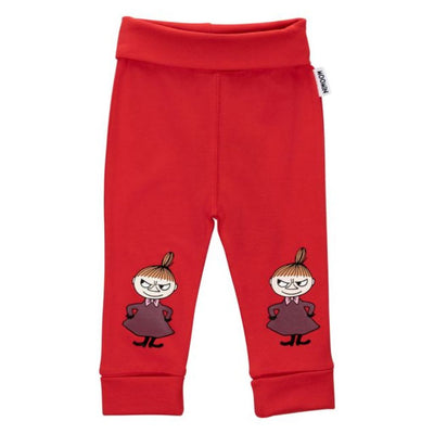 Mjúkar rauðar Múmín ungbarna buxur skreyttar myndum af Míu Litlu.