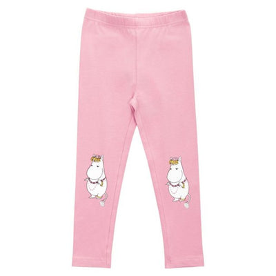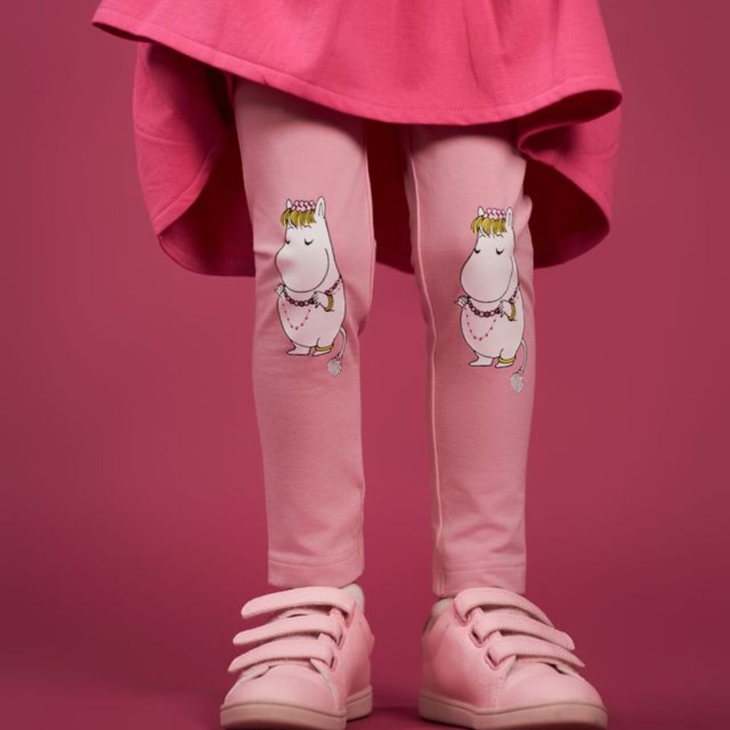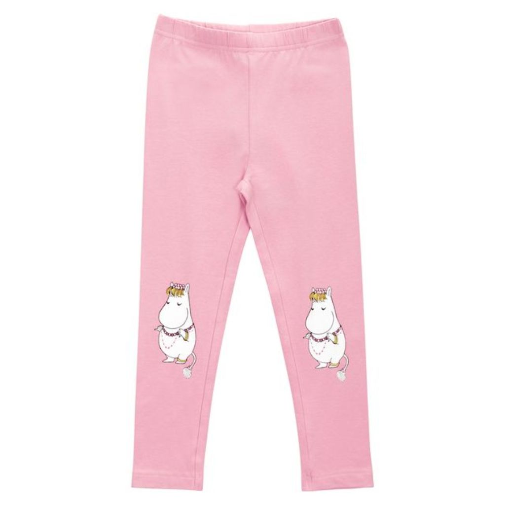 Bleikar leggings buxur með myndum af Snorkstelpunni á hnjánum. Teygjanlegt mittisband er á buxunum.