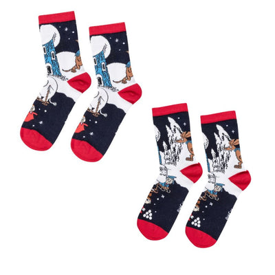 Fallegt blátt og rautt Múmín jóla sokkapar úr mjúku efni sem hægt er að fá eins fyrir alla fjölskylduna. Athugið þetta er eitt par af sokkum, myndin sýnir báðar hliðar af sokkaparinu