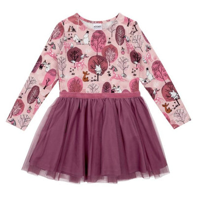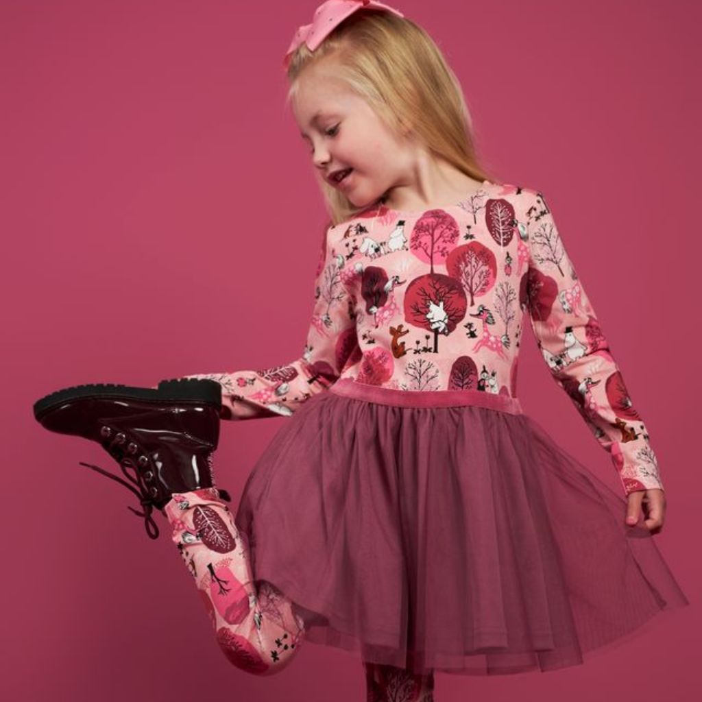 Dásamlegur Múmín tjull kjóll úr lífrænni bómull skreyttur myndum af Snorkstelpunni og Míu Litlu að dansa. Hægt er að fá leggings buxur í stíl.